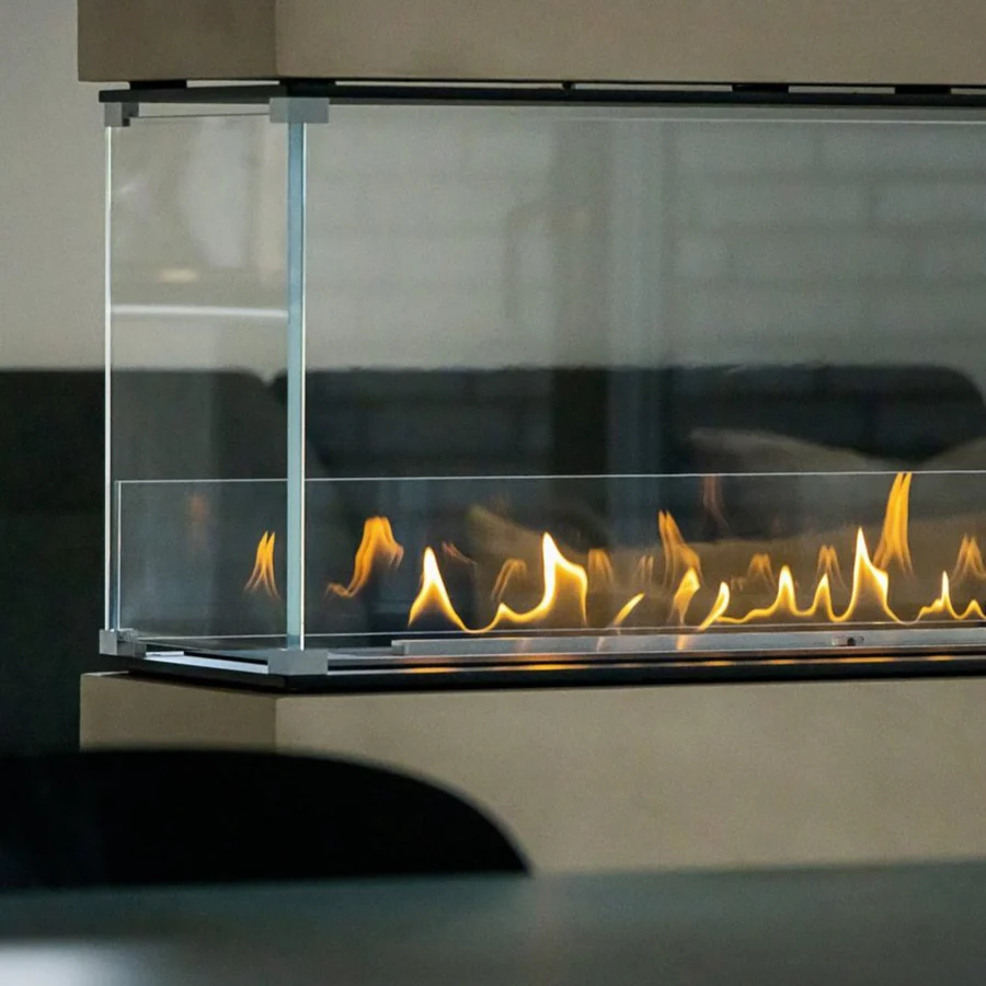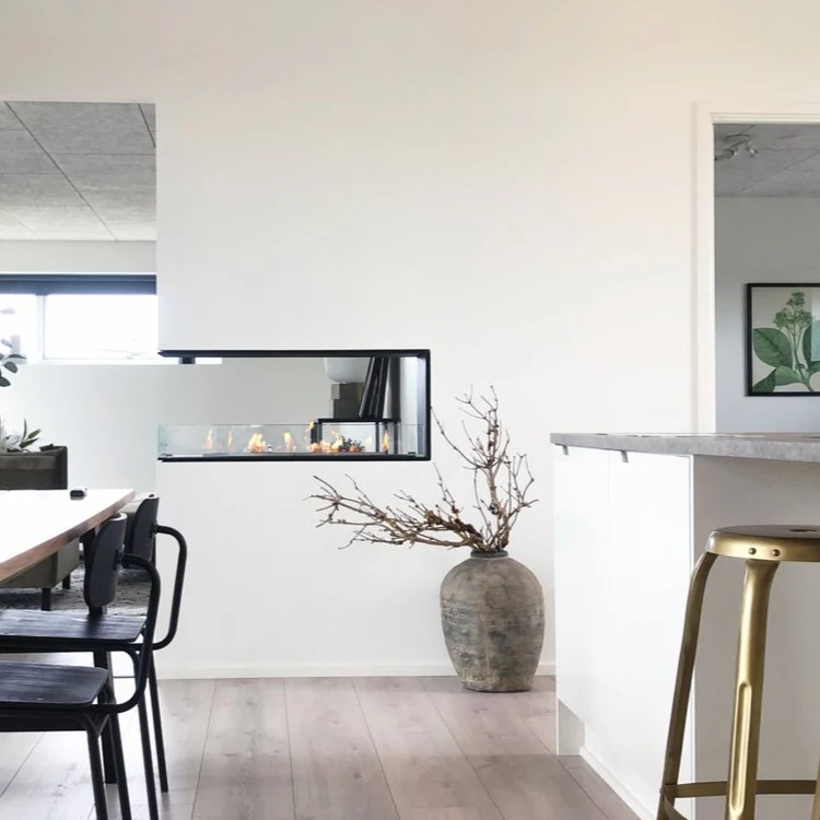 The Decoflame Montreal Room Divider Net Zero Built-In Fireplace features a net zero or Hybrid Mist burner and a stunning three-sided view. Its Danish design and quality make it a standout model, available in various designs to fit seamlessly into any home. With options for manual and electronic bioethanol burners, as well as remote control and app control, this fireplace offers easy and safe operation from any position. All Decoflame fireplaces are crafted and tested for quality at our headquarters in Vestbjerg.