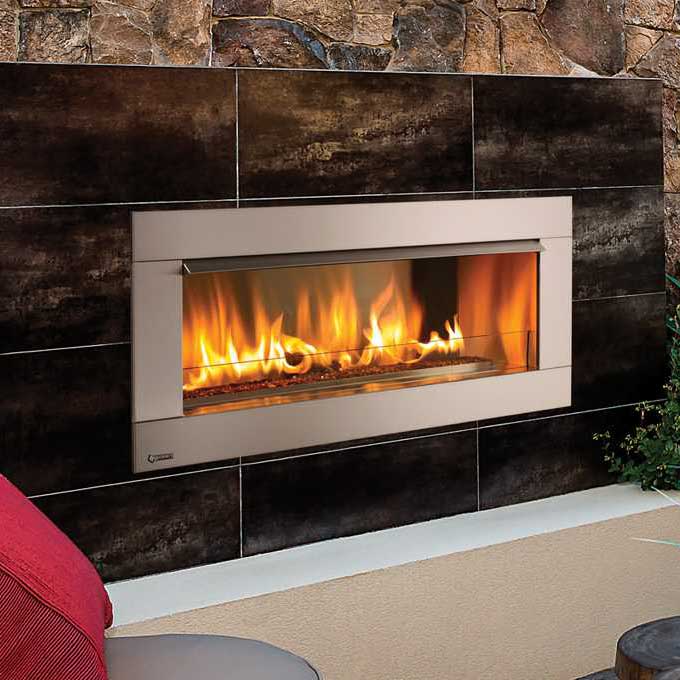 All of the sophisticated, contemporary styling and quality workmanship is mirrored in this dramatic outdoor fireplace. This fireplace delivers beautiful wide angle flames amplified by a reflective stainless steel body and picture frame faceplate. A tempered glass wind shield ensures a strong flame picture and the seasonal weather cover (included) will protect the fireplace when it’s not in use.